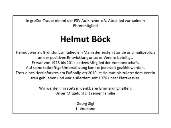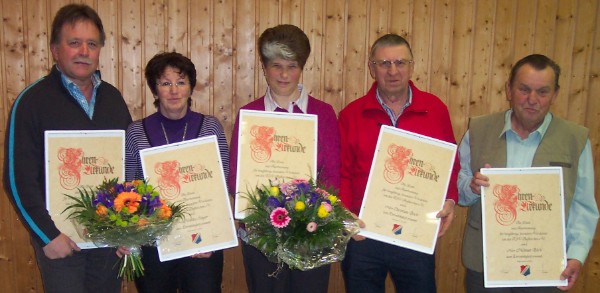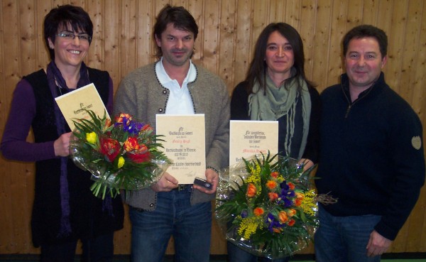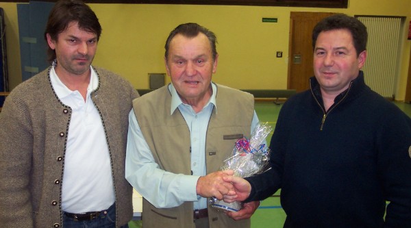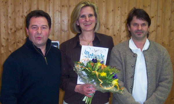 -------------------------------------------------------------------- Mehrzweckhalle Aufkirchen: !!!!Hier finden Sie die Historie sowie das aktuelle Konzept der Aufkirchner Ortsvereine zum Download (4MB)!!!! -------------------------------------------------------------------- Das FSV-Infoheft 2011 steht hier für Sie zum Download bereit! Viel Spaß! -------------------------------------------------------------------- Ehrungen der JHV vom 15. Februar 2011  | Bei der diesjährigen Jahreshauptversammlung des FSV Aufkirchen wurden für langjährige Vorstandsarbeit folgende Vorstandsmitglieder vom BLSV-Kreisvorsitzenden Eckhard Schafferus geehrt: - für 10-järige Tätigkeit in der Vorstandschaft mit der BLSV-Verdienstnadel in Bronze mit Kranz Roswitha Koblitz und Georg Sigl - für 20-järige Tätigkeit in der Vorstandschaft mit der BLSV-Verdienstnadel in Silber mit Gold Monika Huber Foto von li.: Roswitha Koblitz, Georg Sigl, Monika Huber u. 2. Vorstand Hannes Kiser |  | Bei der diesjährigen Jahreshauptversammlung des FSV Aufkirchen wurden für langjährige Verdienste um den Verein vom 1. u. 2. Vorstand Georg Sigl u. Hannes Kiser folgende Mitglieder zu Ehrenmitglieder ernannt: - Irmi Böck: 33 Jahre Mitglied (seit 1978) 1978-80 2. Schriftführerin 1980-82 1. Schriftführerin 1982-92 1. Jugendleiterin Fußball - Christian Böck: Gründungsmitglied des FSV Aufkirchen (seit 1976) 1978-80 2. Jugendleiter Fußball 1980-82 2. Vorstand 1982-90 1. Vorstand 1990-92 Organisationsleiter Fußball - Riki Singer: 34 Jahre Mitglied (seit 1977) 1982-2000 1. Schriftführerin bis jetzt immer noch sehr engagiert, vor allem in der Tennisabteilung - Hans Singer: 34 Jahre Mitglied (seit 1977) 1980-82 Technischer Berater für Bauwesen 1983-90 2. Vorstand 1990-2000 1. Vorstand hatte großen Anteil am Tennisplatzneubau 1991 u. Neubau der Vereinsunterkunft am Sportplatz 1993 bis jetzt immer noch sehr engagiert, vor allem in der Tennisabteilung (ist zuständig für Tennisplatzpflege) - Helmut Böck: Gründungsmitglied des FSV Aufkirchen (seit 1976) 1976-84 3. Kassier 1984-90 2. Kassier 1990-2011 3. Kassier seit 1976 Platzkassier (35 Jahre) Foto von li.: Hans u. Riki Singer, Irmi u. Christian Böck, Helmut Böck |  | Bei der JHV am verabschiedete der 1.- (Georg Sigl) u. 2. Vorstand (Hannes Kiser) unseren langjährigen 3. Kassier Helmut Böck mit einem FSV-Krügerl u. einem Gutschein aus der Vorstandschaft. Helmut Böck ist Gründungsmitglied und war seit 1976 in der Vorstandschaft tätig. Außerdem war er 35 Jahre Platzkassier. Sein Zusammenbruch im September auf dem Fußballplatz sorgten auch im Tagblatt für große Schlagzeilen. Inzwischen hat er sich wieder gut erholt, jedoch möchte er sich aus gesundheitlichen Gründen aus den aktiven Ämtern zurückziehen. Als begeisteter Zuschauer wird er allerdings immer noch auf dem Fußballplatz zu finden sein. Der FSV Aufkirchen bedankt sich recht herzlich für seine immer zuverlässige Hilfe u. Tätigkeit in den letzten 35 Jahren für den Verein und wünscht ihm noch viel Gesundheit für seine weitere Zukunft. |  | Bei der JHV ehrte unser 1. Vorstand Georg Sigl im Namen des Bayerischen Turnerbund e.V. Ilka Weiß für 10-jährige Gymnastik-Übungsleitertätigkeit mit der Übungsleiternadel in Silber mit Gold. Auf dem Foto von li.: 2. Vorstand Hannes Kiser, Ilka Weiß u. 1. Vorstand Georg Sigl