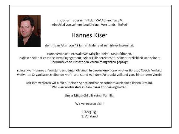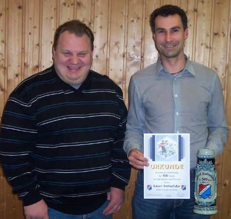 |  | |  | Bei der diesjährigen Jahreshauptversammlung des FSV Aufkirchen wurden für eine Runde Anzahl Fußballspiele folgende Spieler geehrt: Foto von li.: Abteilungsltg. Stephan Böck, Jürgen Hoepfner (300), Mathias Blank (300), Robert Rothenfußer (500), Rainer Burkart (400), Stefan Hörmann (100), Michael Bauernfeind (100) | | Bei unserer JHV des FSV Aufkirchen wurde Robert Rothenfußer für 500 Fußballspiele vom 1. Abt.ltg Fußball Stephan Böck geehrt. Robert Rothenfußer bestritt sein erstes Seniorenspiel am 15.07.1993. Nachdem er zwischendurch für 2 Jahre beim SV Odelzhausen spielte, benötigte er für seine 500 Spiele 15 œ Jahre Auf dem Foto vo. li.: 1. Abt.ltg. Stephan Böck u. Robert Rothenfußer |